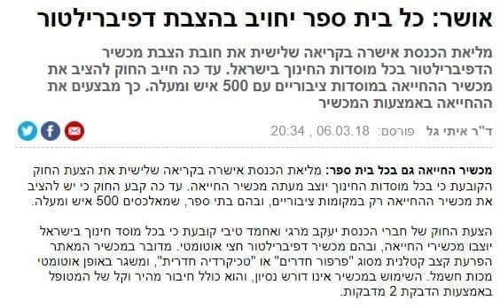 1. האם חובה להציב דפיברילטור בכל בית ספר?